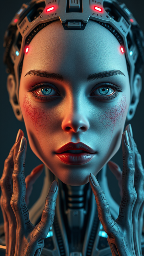 Artificial intelligence female visage android, ultra-detailed graphics, cinematic illumination, 4k, artstation, hyperrealistic, complex details, formidable, rim lighting, diffraction grading, RTX, inspired by Ivan Shishkin lowres, text distortion, cropped, low fidelity, jpeg distortions, unattractive, repetitive, eerie, disfigured, out-of-frame, additional digits, deformed hands, poorly sketched hands, sketchy face, anomalies, warped, unclear, withered, incorrect anatomy, disproportionate, extra limbs, mirrored face, distorted, odd proportions, misshapen limbs, absent arms, absent legs, superfluous arms, superfluous legs, merged digits, excessive fingers, elongated neck.