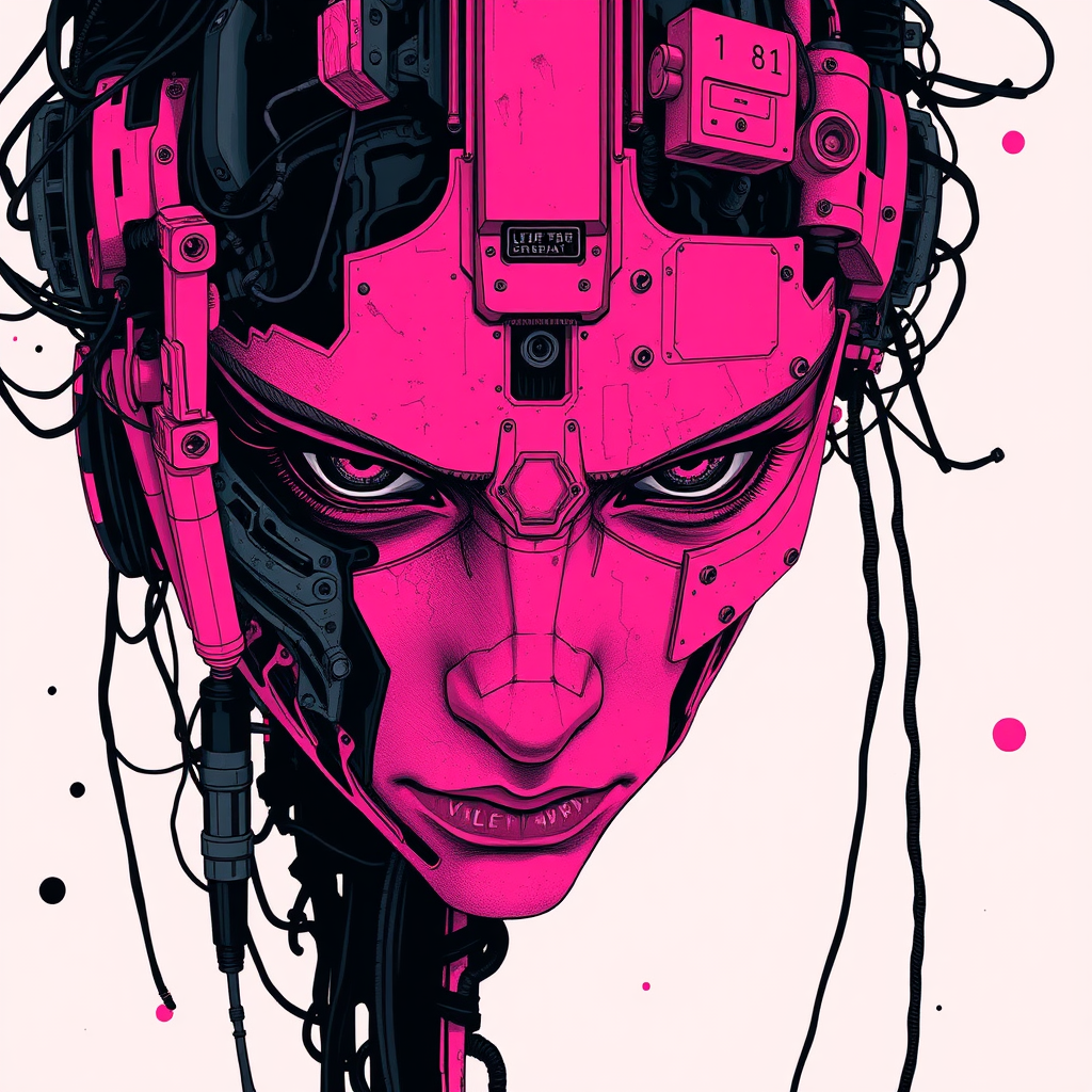 Artistic depiction of an upper-body synthetic mechanic face with intricate complexity details, featuring a deep, intense gaze. The limited color palette is dominated by deep hot pink and accented by black, creating a contrast that enhances the dystopian, cold atmosphere reminiscent of Tsutomu Nihei's work. The composition explores chaotic elements with a distinct raw style, maintaining originality with a slight creative twist.