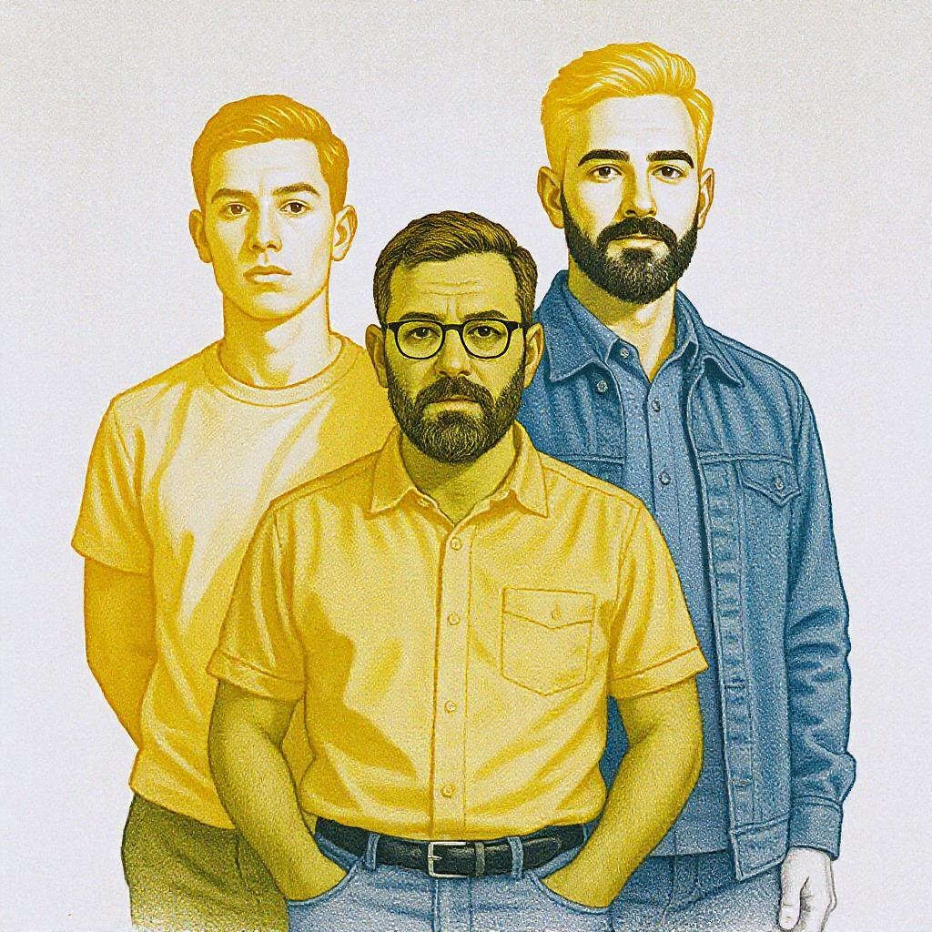 Artistic illustration of three men, each distinct yet unified by vibrant yellow outlines, set against a background that emphasizes their individuality. The composition is vertically oriented, capturing the essence of camaraderie and contrast, as each figure contributes a unique posture and expression to the harmonious arrangement.