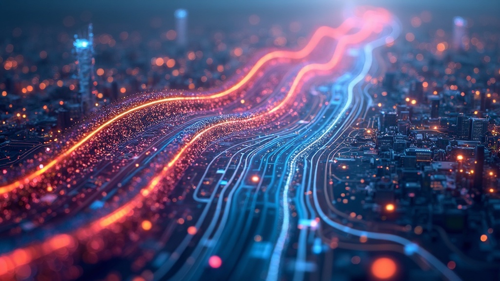 A vibrant and dynamic artistic interpretation of the digital landscape, featuring fluid, interconnected waves of color and light symbolizing high-speed broadband connectivity, with abstract shapes and patterns representing data flow and communication, set against a backdrop of a futuristic cityscape to convey the seamless integration of technology and urban life.
