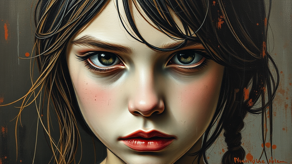 Artistic oil painting capturing a right face composition portrait of a girl with hollow eyes and an intense gaze, featuring a grainy touch and minimalist avant-garde style. The piece showcases rich detailing in a manner inspired by Diego Velazquez, incorporating numerous knives for an edgy effect. The texture is rough, enhancing the overall raw, dynamic quality of the work.