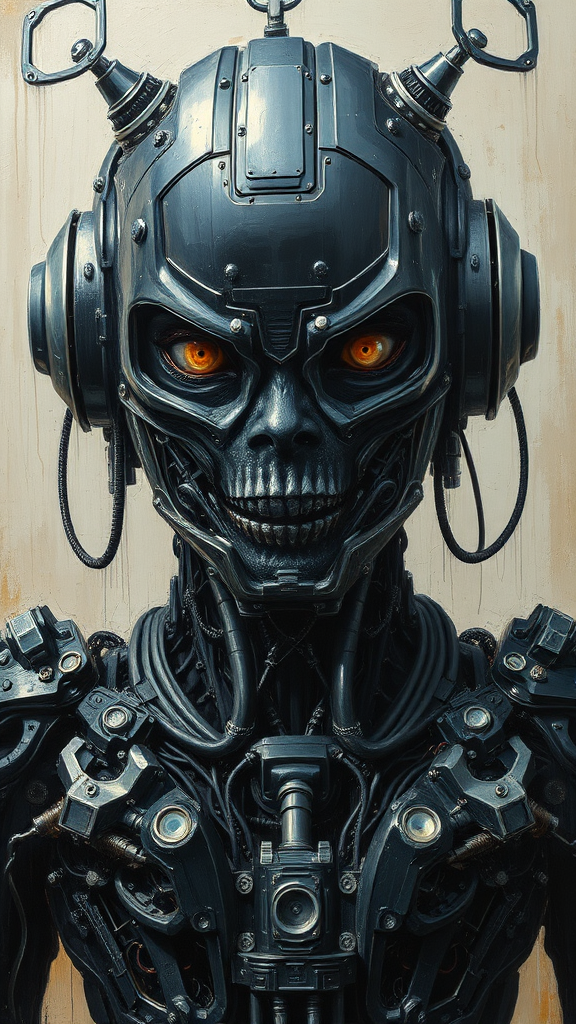 Artistic oil painting featuring a front view of an upper body with a heavy brushed technique, showcasing a sci-fi inspired bizarre mechanical human with a haunting gaze. The scene is reminiscent of a Tsutomu Nihei style art, set in a dystopian world. The design is unsettlingly intricate, with multiple manipulated features, blending black with chrome elements. Ultra-realism defines the piece, emphasizing real paint textures and meticulous detail. The atmosphere is charged with creative unpredictability, capturing a raw style with unique expressions in a surreal yet compelling narrative.
