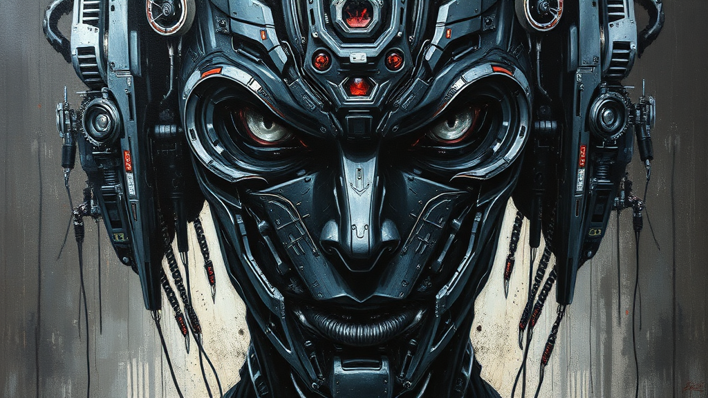 Artistic oil painting front view upper body heavy brushed sci-fi surreal mechanical human intense gaze inspired by Tsutomu Nihei art dystopian unsettling multi-faceted black with chrome elements ultra-realistic myriad details tangible paint texture high chaos ratio with a vertical canvas orientation capturing raw style infused with a stylized complexity level.