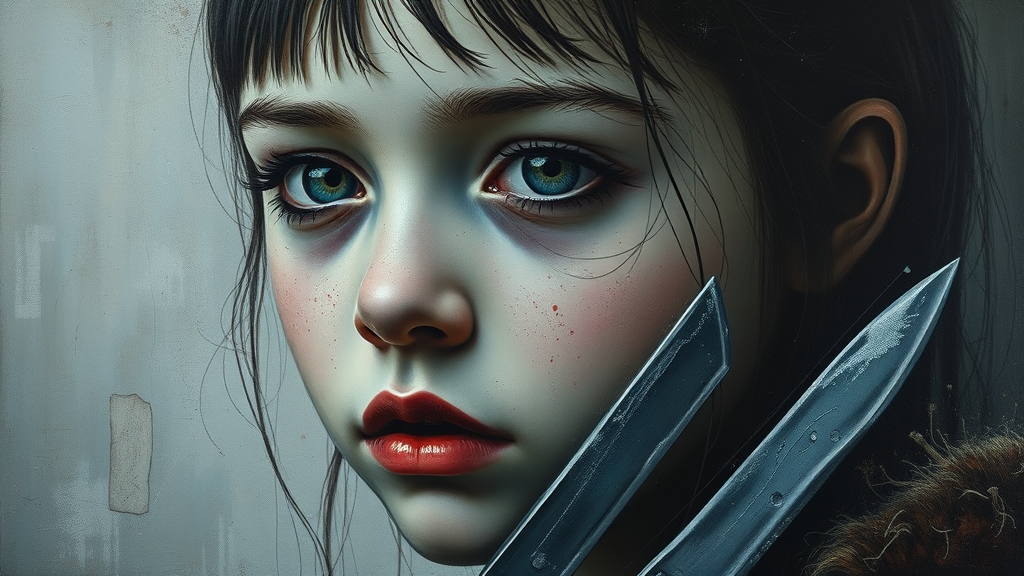 Artistic oil painting of a girl's portrait with vacant eyes, featuring a grainy texture and minimalist avant-garde style. Highlight rich details and an abundance of knives, with a rough, dark atmosphere.