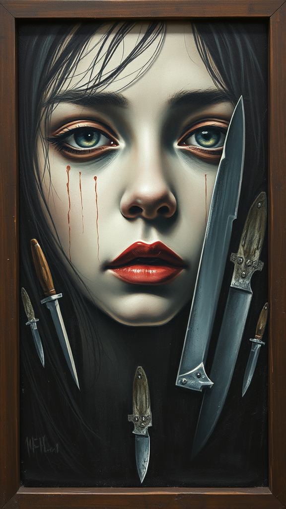Artistic oil painting portraying a girl's face with hollow, expressionless eyes. The composition is minimalist avant-garde, capturing a grainy texture and rich detailing. The portrait incorporates many knives woven into the scene, exuding a rough, dark mood. The artwork is set in an elongated frame, emphasizing the stark contrasts and raw, unrefined style.