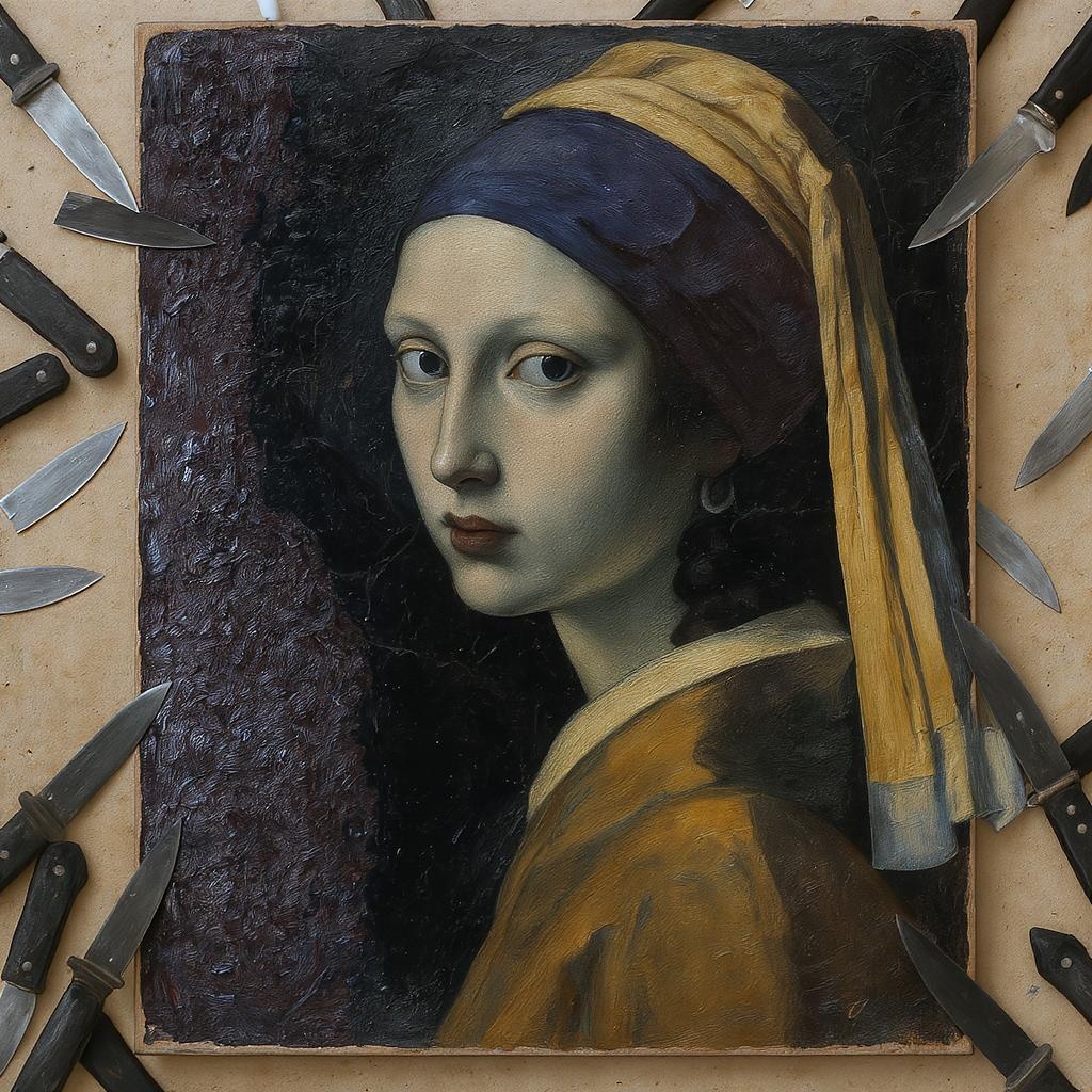 Artistic oil painting, right face composition, portrait of a young woman, hollow eyes, intense gaze, textured finish, minimalist avant-garde, intricate details, style inspired by Diego Velázquez, surrounded by an array of knives, rugged refinement, tall aspect ratio, high quality, raw style, personalized essence.
