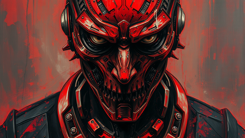 Artistic oil painting texture, front view of an upper body, eerie man, combining a bold brush style, sci-fi being with organic and mechanical features, eyes fixed intensely, focused face, forming a dystopian ambiance, technological horror, color palette of deep crimson and rich black, embodying the tumult and ruggedness of Tsutomu Nihei's bleak settings, intricate details for heightened realism, --ar 9:16 --style raw --profile ue2yzjl --stylize 300 --v 6.1.