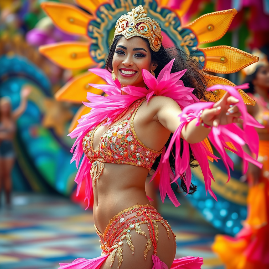 Artistic photography capturing a stunning female performer in shimmering pink and gold attire dancing in the vibrant Rio Carnival; showcasing an hourglass figure, the image is infused with an RTX ON style marked by colorful mosaics and chrome-plated accents. The scene is joyful and optimistic, utilizing bold lines, intricate plastic textures, and delicate embroidery, all harmoniously blended together to create a striking visual spectacle.