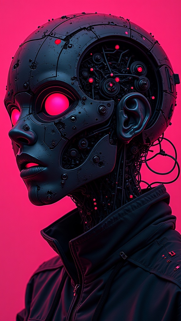 View this AI-generated image featuring artistic portrayal of upper body featuring a synthetic mechanic face intricate complexity in details and a profound deep gaze the color palette is limited dominated by intense deep hot pink contrasted with stark black set in a dystopian cold atmosphere reminisc