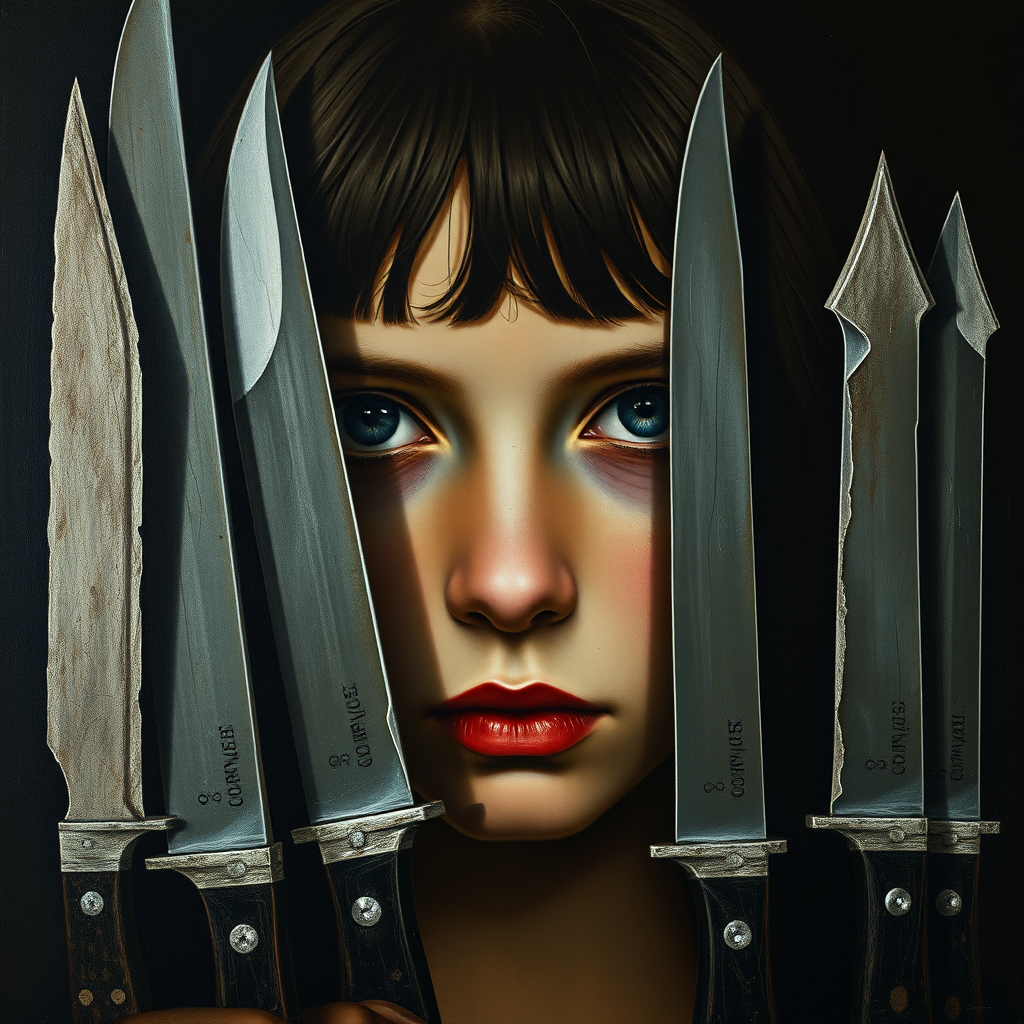 Artistic portrayal of a girl with hauntingly vacant eyes, her gaze piercing through a grainy texture. The scene is infused with the essence of Diego Velazquez's style, showcasing an array of knives with a raw and rough aesthetic. The portrait is an oil painting, capturing the mysterious intensity and depth of the subject in a vertical 9:16 aspect ratio, exuding a personalized, evocative atmosphere.