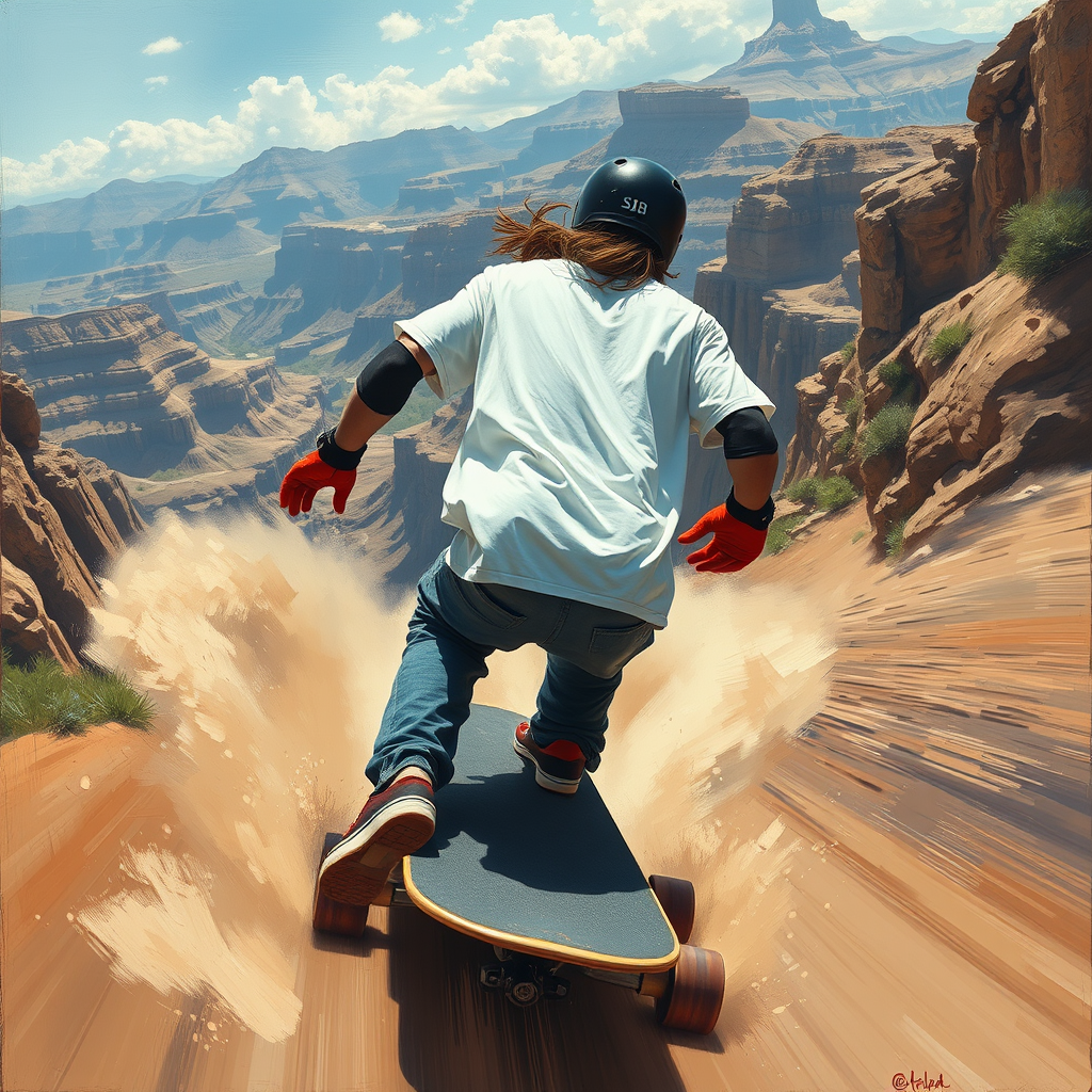 Artistic raw painting art capturing an extreme skateboarding adventure down a rugged mountain, featuring a pro skateboarder on a longboard racing downhill. The scene follows from behind, focusing on the motion and adrenaline. The skateboarder wears a sleek black helmet, a loose white T-shirt billowing with the wind, denim jogger pants, and sturdy black knee pads. Bright red protective gloves contrast with the skater's outfit, and they sport Nike SB skate shoes for maximum grip and control. Clouds of dust flutter around, enhancing the dynamic sense of speed. The backdrop features a majestic mountain landscape with canyons and natural vistas, pulling the viewer into the exhilaration of the ride.