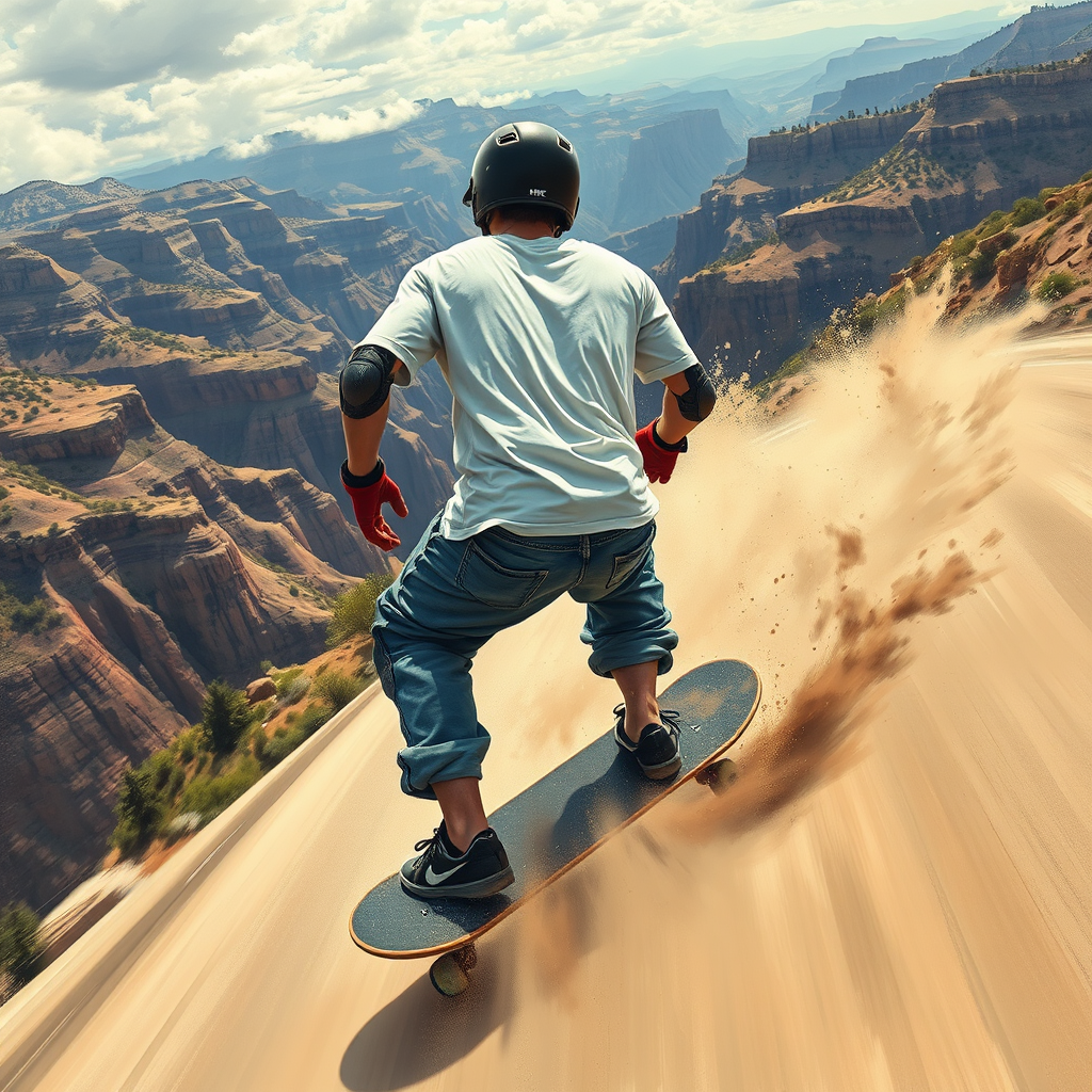 Artistic raw painting art of an extreme skate mountain scene with a pro skateboarder speeding downhill on a longboard, followed from the back. The skateboarder wears a black helmet, a loose white T-shirt, denim jogger pants, and black knee pads. They're equipped with red protective gloves and Nike SB skate shoes, surrounded by fluttering dust. The background features a dramatic mountain landscape with canyons and nature, creating a sense of velocity. The professional artwork captures the movement and intensity with subtle artistic modifications, focusing on the dynamic flow and rugged texture of the scene.