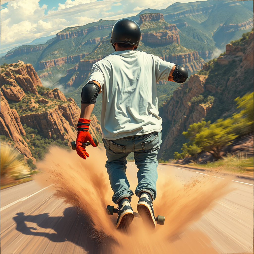 Artistic rough painting art capturing a pro skateboarder speeding downhill on an extreme skate mountain. The scene follows from the back, featuring a black helmet, a loose white T-shirt fluttering in the wind, denim jogger pants, and black knee pads. The skateboarder wears vibrant red protective gloves and Nike SB skate shoes, all against a backdrop of a mountain with dramatic canyons and lush nature. Clouds of dust trail behind, emphasizing the incredible sense of speed. The artwork is professional with a raw style, enhanced by the natural beauty of the landscape, creating an intense and dynamic visual experience.
