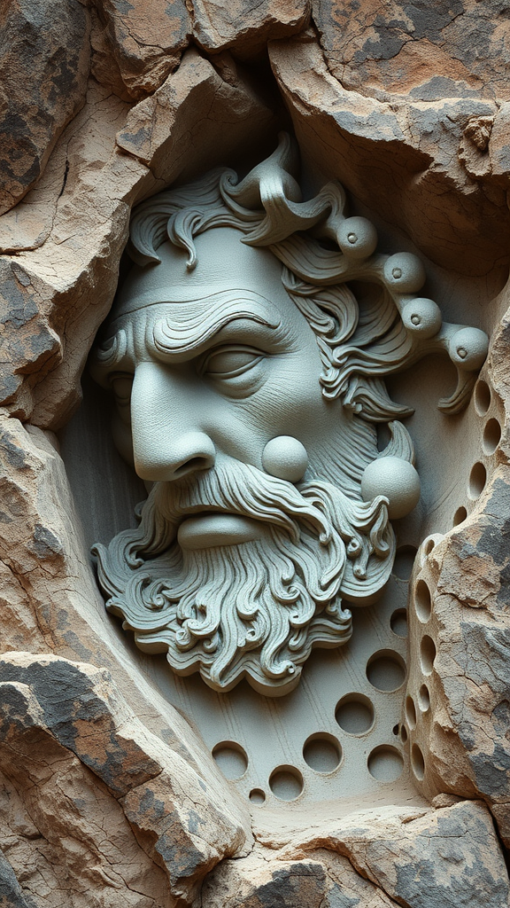 Artistic sculpture carved into cliffside, showcasing hyper-realistic details, intricate facial expressions, luminous textures reminiscent of Cryengine graphics, inspired by Ingrid Baars, multi-paneled narrative style akin to Guido van Helten, conceptually rich and immersive -- aspect ratio 31:64 -- high stylization level 750 -- version 6