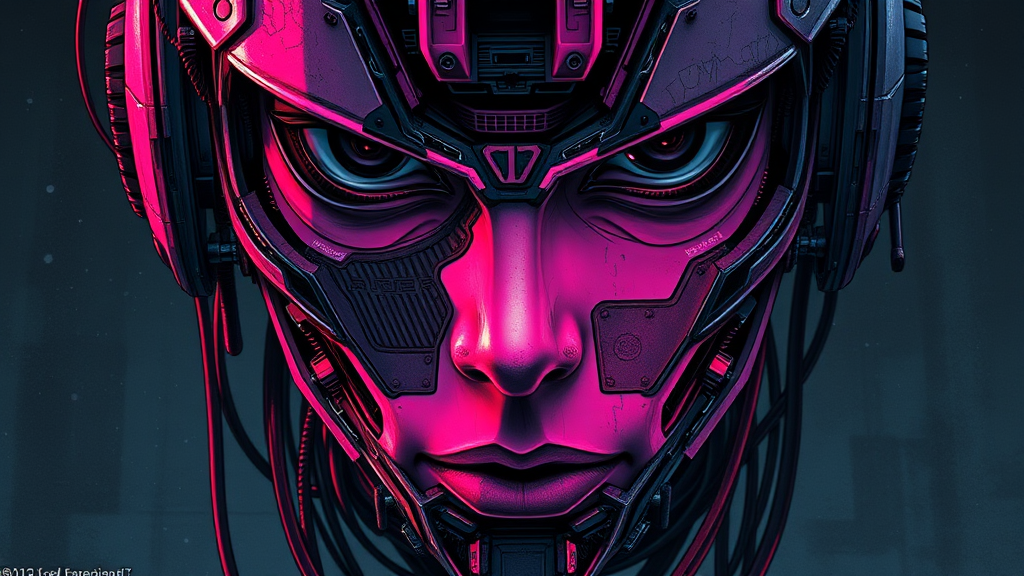 Artistic upper-body depiction of a synthetic mechanical face with intricate complexity and a deep, penetrating gaze, employing a limited color palette dominated by deep hot pink contrasted by black. Set in a cold, dystopian atmosphere reminiscent of Tsutomu Nihei's aesthetic, infused with an element of controlled chaos, maintaining an aspect ratio of 9:16 with a raw style and heightened stylization.