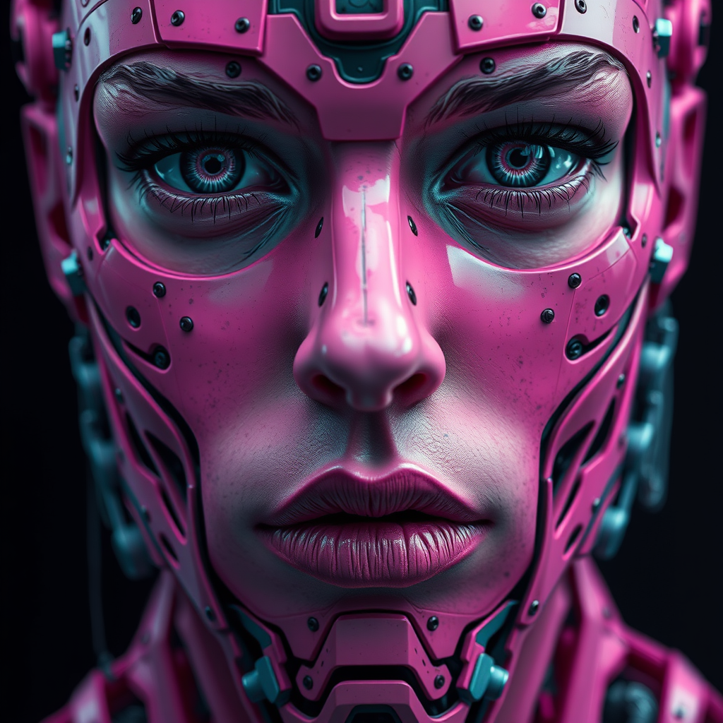 Artistic upper-body portrait of a synthetic mechanic face with intricate details, featuring a deep and intense gaze. The color palette is dominated by deep hot pink and accented with black, creating a dystopian and cold atmosphere. Inspired by Tsutomu Nihei, the composition is chaotic yet refined, maintaining a raw and stylized essence with an aspect ratio of 9:16.