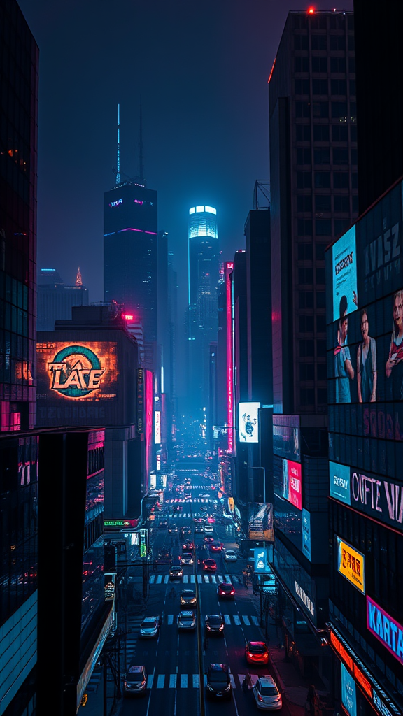 As darkness envelops the city, a skyline of towering buildings illuminated with vibrant neon lights comes into view, casting a glow on the bustling streets below. Holographic ads flicker across the facades, bringing a futuristic touch to this cyber dystopian landscape. Each detail is captured with cinematic noise, the scene fading into shadowy corners. The high contrast imagery is rendered in high-definition, revealing intricate details that feel almost tangible. The cityscape is an amalgamation of hyper-realism and imagination, a vivid 8k snapshot of urban futurism.