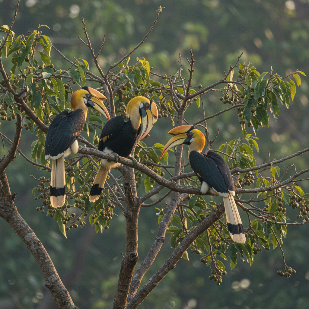 As dawn's first light kissed the canopy, hornbills gathered near the fruit-laden trees, engaging in their serene morning ritual, meticulously preening each other's feathers with gentle precision, a symphony of care echoing through the stillness of the waking forest.