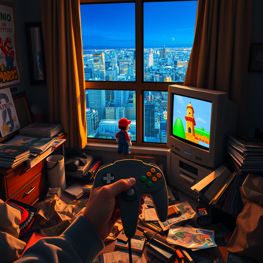 As I slowly awake from my nap, I find myself in the dim glow of my cluttered room, my hand still clutching the well-worn controller for my Nintendo 64. The unmistakable silhouette of Mario stands idle on the screen, frozen amidst the vibrant, pixelated world of Super Mario 64 displayed on the old CRT television. The air is tinged with the lingering aroma of yesterday's fast food, wrappers scattered haphazardly among the chaotic jumble of posters and magazines sprawled across the floor. Through the slightly open window, the sprawling skyline of a city that echoes the bustling energy of Tokyo looms, its neon signs and distant murmur of life creating a surreal backdrop to my teenage haven.