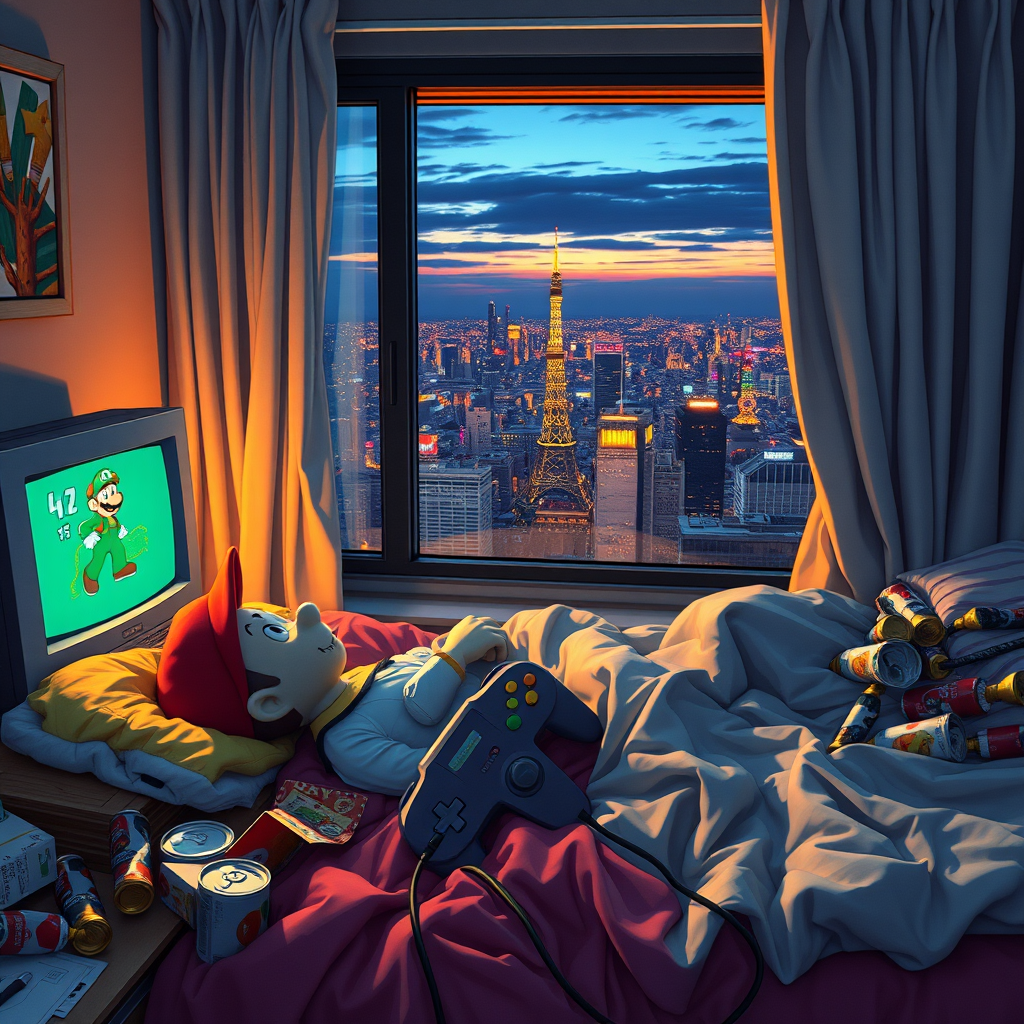 As I slowly awaken from my nap, I find myself sprawled across my unkempt bed, the familiar weight of a Nintendo 64 controller resting in my hand. On the flickering screen of my trusty old CRT television, Mario stands idle in the vibrant world of Super Mario 64, awaiting my next move. My room is a chaotic jumble, littered with empty fast-food wrappers and soda cans, the residual evidence of a late-night gaming session. Through the narrow gap in the curtains, the sprawling skyline of a bustling city resembling Tokyo stretches out before me, its neon lights beginning to flicker to life against the setting sun.