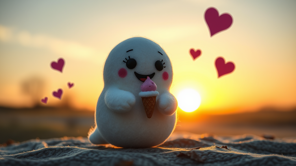 As the first light of a beautiful sunrise streaks across the sky, a small, simple, cuddly felt ghost with a round, plump body exudes warmth and charm. Its soft texture invites a gentle touch, and in its tiny hands, it clutches an ice cream cone, the treat threatening to melt under the warm glow of the dawning day. The ghost's face is adorned with a joyful smile that seems to radiate love and happiness, reaching out to every onlooker with an irresistible charm. Its large, expressive eyes gaze directly into the camera, projecting an innocence and joy that could soften even the toughest of hearts. Around it, floating gently in the morning air, are delicate felt hearts, crafted with care, adding to the scene's enchanting atmosphere. The harmonious combination of felt, smiles, and tender hearts creates an ambiance that is both uplifting and heart-melting—a perfect blend of simplicity and sweetness at the dawn of a new day.