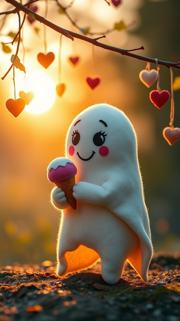As the first light of dawn bathes the world in a gentle golden hue, a small, plump felt ghost stands, wrapped in the warmth of its own simple charm. Its soft fabric glows softly under the sunrise, and in its little felt hands, it clutches a joyously colorful ice cream cone. With a wide, joyful smile that radiates pure happiness, the ghost gazes directly into your eyes, a sight so endearing it could melt even the toughest of hearts. All around, felt hearts dangle from nearby branches, swaying gently in the soft morning breeze, adding a whimsical touch to the enchanting scene. The air is filled with an aura of pure love and innocent delight, creating an atmosphere of serenity and joy as the world awakens to a new day filled with endless possibilities.