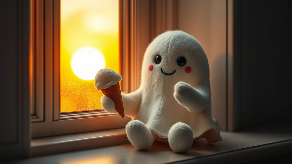 As the golden hues of sunrise gently kiss the world awake, a small, chubby felt ghost sits quietly by a window. Its soft, plush body exudes warmth and comfort, while a tiny hand cradles a delicate ice cream cone, a testament to simple joys. The ghost's eyes, two gleaming beads of infinite delight, gaze directly into the camera, conveying a pure, innocent happiness. Its joyful smile is so genuine and infectious that it can soften even the hardest of hearts, evoking a tender nostalgia for carefree moments. Surrounding it is an ambiance of love, as if the very air vibrates with gentle whispers and the unspoken promise of a new day filled with possibilities. This enchanting scene, painted with the soft light of dawn and the ghost's timeless charm, wraps around the viewer like a cozy blanket, kindling an inner warmth that lingers, much like the fading stars of the morning sky.