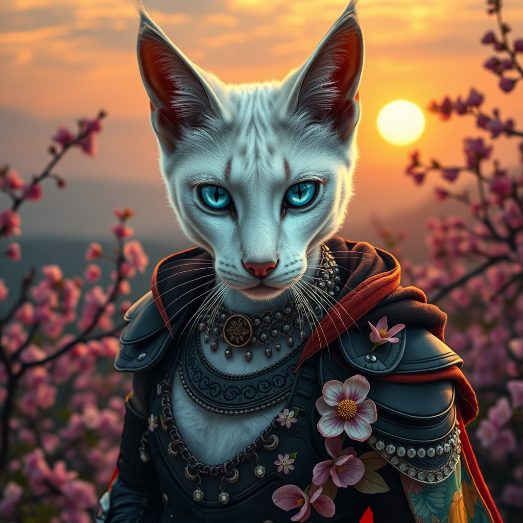 As the golden sun dips beneath a horizon adorned with a tapestry of vibrant blossoms, a breathtaking tabaxi flowerpunk girl captures the center of attention. Her sleek white fur gleams in the dimming light, while her striking blue eyes seem to pierce the viewer's very being. She is clad in an intricate ensemble, featuring delicate flowery chainmail interwoven with black lotus armor, and a colorful cloak elegantly draped over her shoulder. The dramatic angle of the scene showcases her in a commanding stance, her gaze direct and enigmatic. This digital art piece is a high-definition, ultradetailed masterpiece, with every detail meticulously crafted to convey a spectrum of emotions. The dynamic pose and intense eye contact create an immersive experience, making it feel as though the viewer is standing right before her.