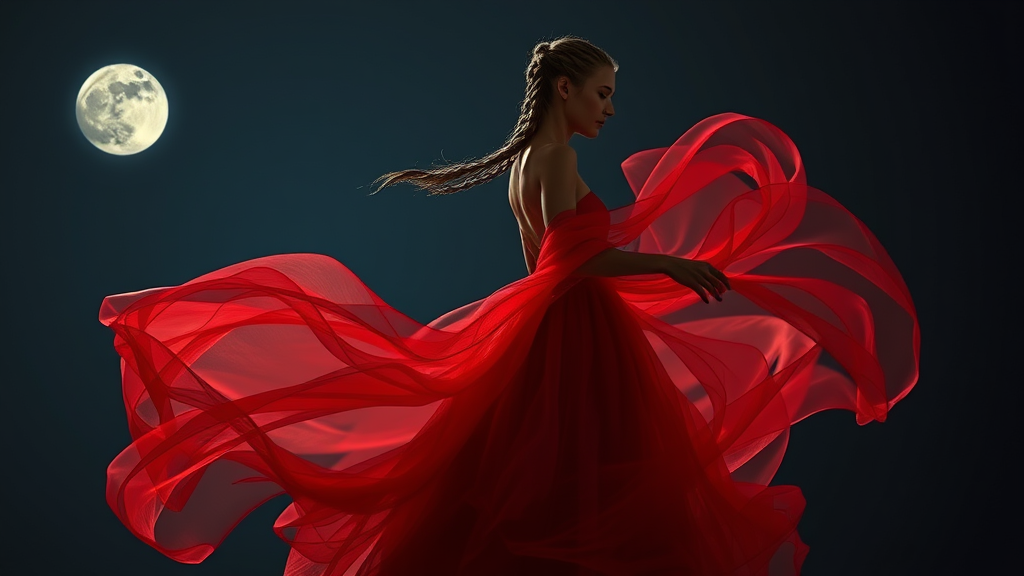 As the moon ascends into the night sky, your attention is caught by a mesmerizing scene in the distance. A breathtaking woman, draped in a flowing dress made of swirling crimson mist, glides gracefully to the rhythm of an inaudible melody. Her hair, adorned in an intricate braided ponytail, catches the moon's silvery glow with every movement. Her dance is so fluid and seamless that it becomes difficult to discern where her form ends and the ethereal mist begins. As she twirls in the darkness, the mist coils and spirals around her, casting a mystical radiance that highlights her captivating features. An irresistible aura surrounds her, drawing you in with curiosity and the urge to unveil the enigma behind her elegant motions.