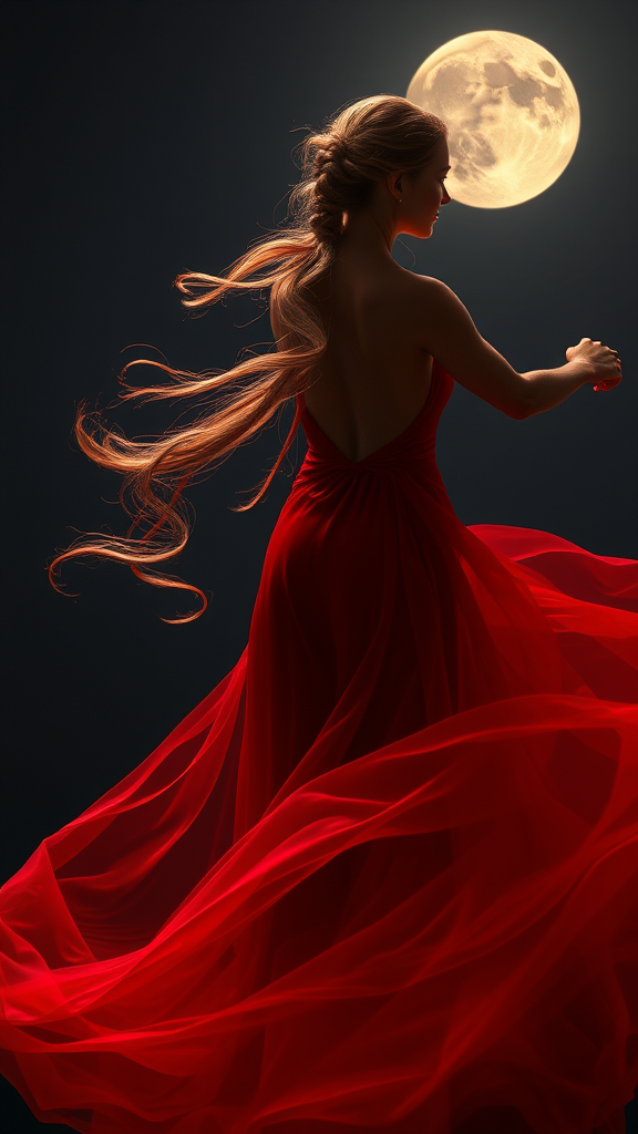 As the moon climbs high into the night sky, you glimpse an enchanting vision in the distance. A mesmerizing woman in a flowing gown of swirling red mist sways gracefully to an unheard melody. Her hair, expertly woven into a glossy braid, catches the light of the moon, each strand shimmering with ethereal radiance. She moves with such seamless grace that discerning where her form ends and the mist begins is nearly impossible. As she dances through the darkness, the mist coils and spirals around her, casting a mystical glow that highlights her features. You find yourself irresistibly drawn to her enigmatic presence, pondering the secrets hidden within her elegant movements.