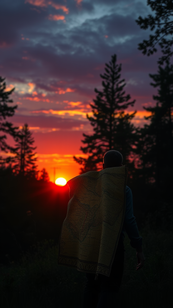 As the sun dipped below the horizon, painting the sky with shades of orange and purple, a solitary figure emerged from the dense forest, carrying an ancient map that whispered secrets of a forgotten world.