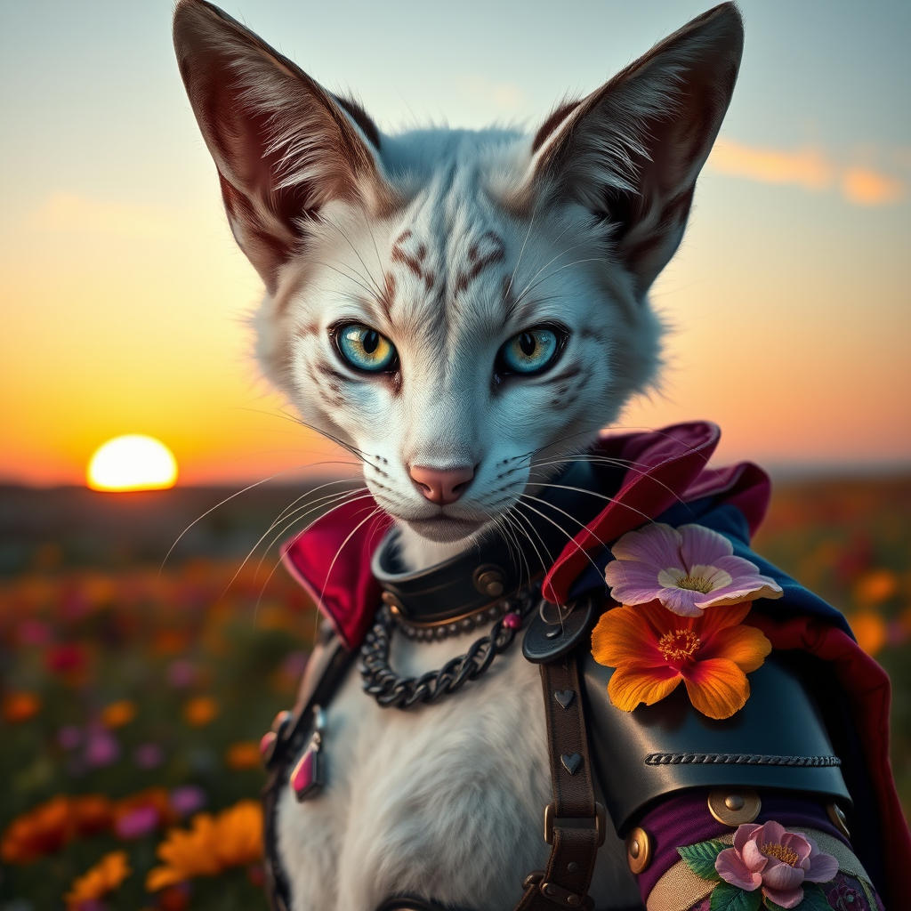 As the sun dips below a horizon of vivid wildflowers, a captivating tabaxi flowerpunk girl commands the center of the scene. Her sleek white fur shimmers in the twilight, and her piercing blue eyes glow with an enigmatic intensity. She wears a delicate chainmail adorned with floral motifs, coupled with sleek black lotus armor. A vibrant, multicolored cloak rests elegantly over her shoulder. Captured from a compelling angle, she strikes a commanding pose, her gaze locked onto the viewer with a blend of mystery and intrigue. This high-definition masterpiece showcases intricate facial details that reveal her emotions with extraordinary clarity. The powerful pose and direct gaze create an immersive experience, drawing the viewer into her world.