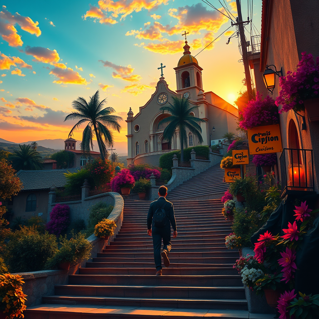 As the sun dips below the horizon, a figure strolls down a vibrant street framed by winding stairs and a majestic church adorned with a glowing saffron roof. The scene bursts with exotic flora and fauna, hinting at a rich tapestry of Hispanic culture with hues of light red and white weaving through the landscape. The air shimmers with a Monet-like dreamscape, where distinctive noses and character-filled faces populate the post-impressionist vision. The dazzling cityscape twinkles with life, capturing the magic of #vfxfriday, as the rhythmic buzz of the city serenades the solitary walker in an enchanting blend of colors and textures.