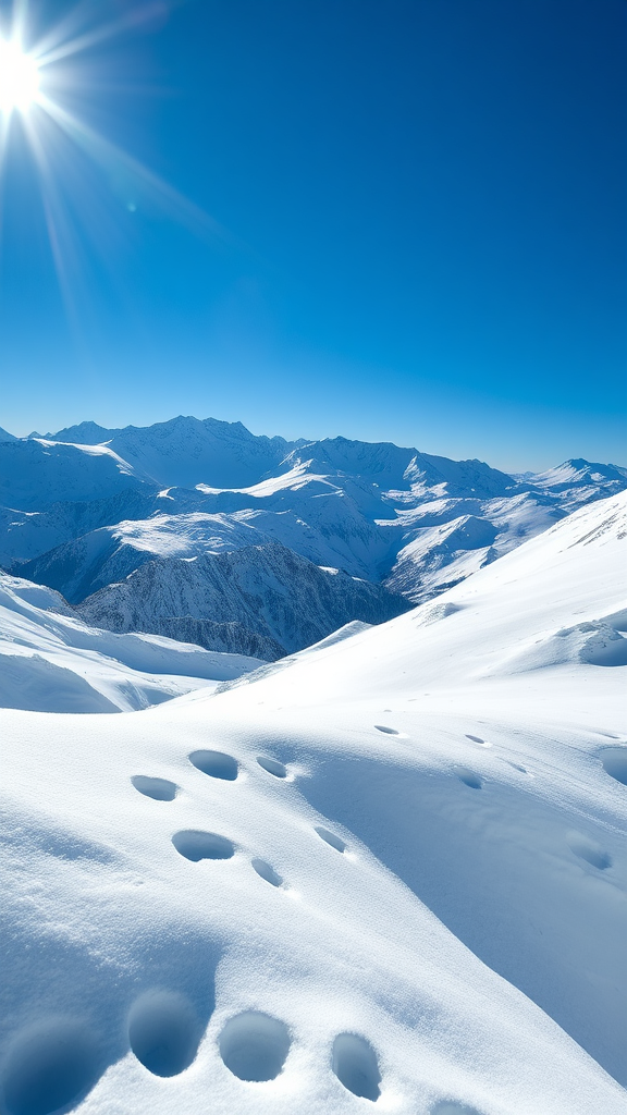 As you gaze around the landscape, the far-off mountains catch your eye, blanketed in a thick layer of pristine snow, their majestic peaks reaching towards a brilliant blue sky. The sunlight dances off the snow, creating a shimmering, almost blinding spectacle that captivates the senses.
