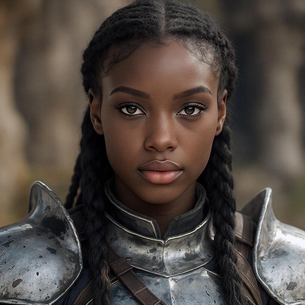 As you move your gaze from her armor, you can't help but be captivated by the intricate features of her face. Her eyes, sharp and resolute, radiate a palpable strength and determination. High cheekbones lend her an air of nobility and grace, while her tightly braided hair accentuates her facial contours, highlighting the elegance of her features.