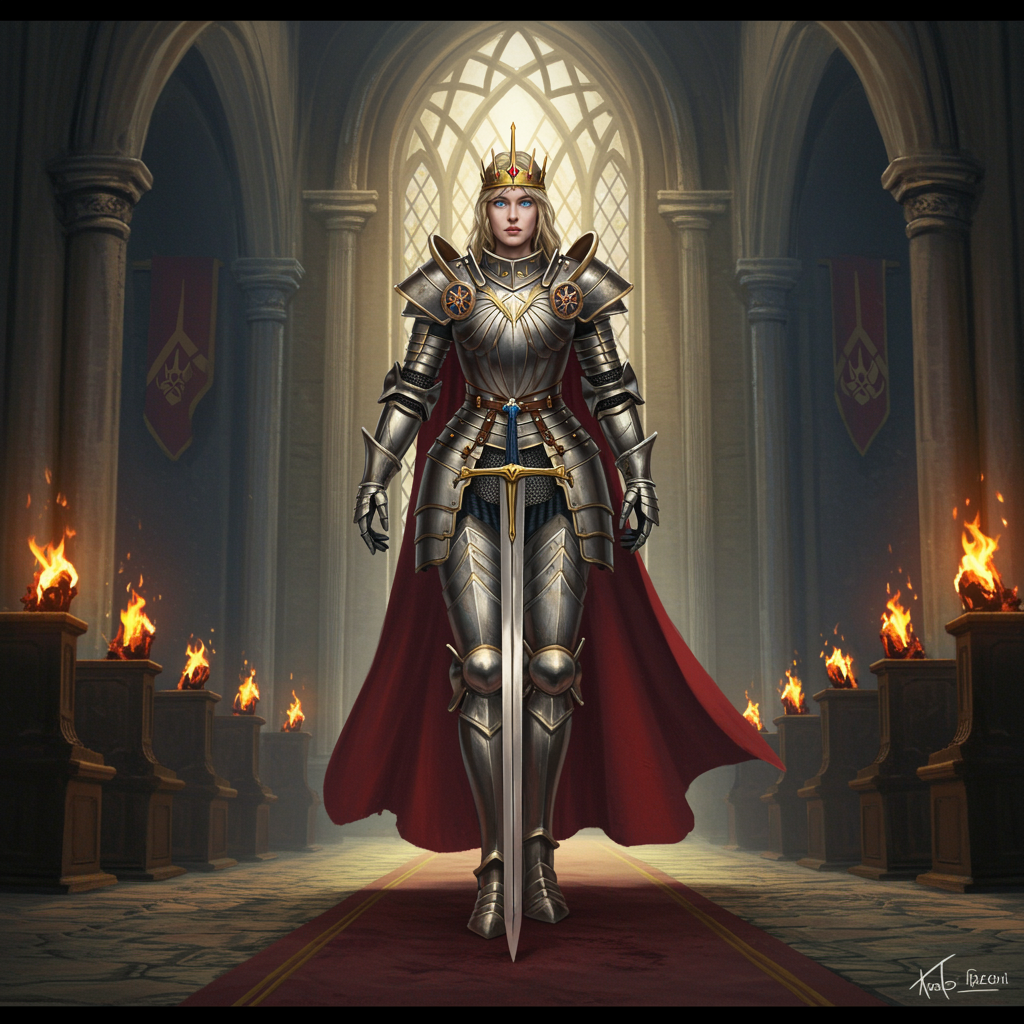 As you step into the grand hall, your gaze is instinctively drawn to its heart, where the supreme Princess stands, encased in a suit of armor that is as breathtaking as it is practical. The armor shimmers under the flickering torchlight, casting a mystical radiance throughout the chamber.