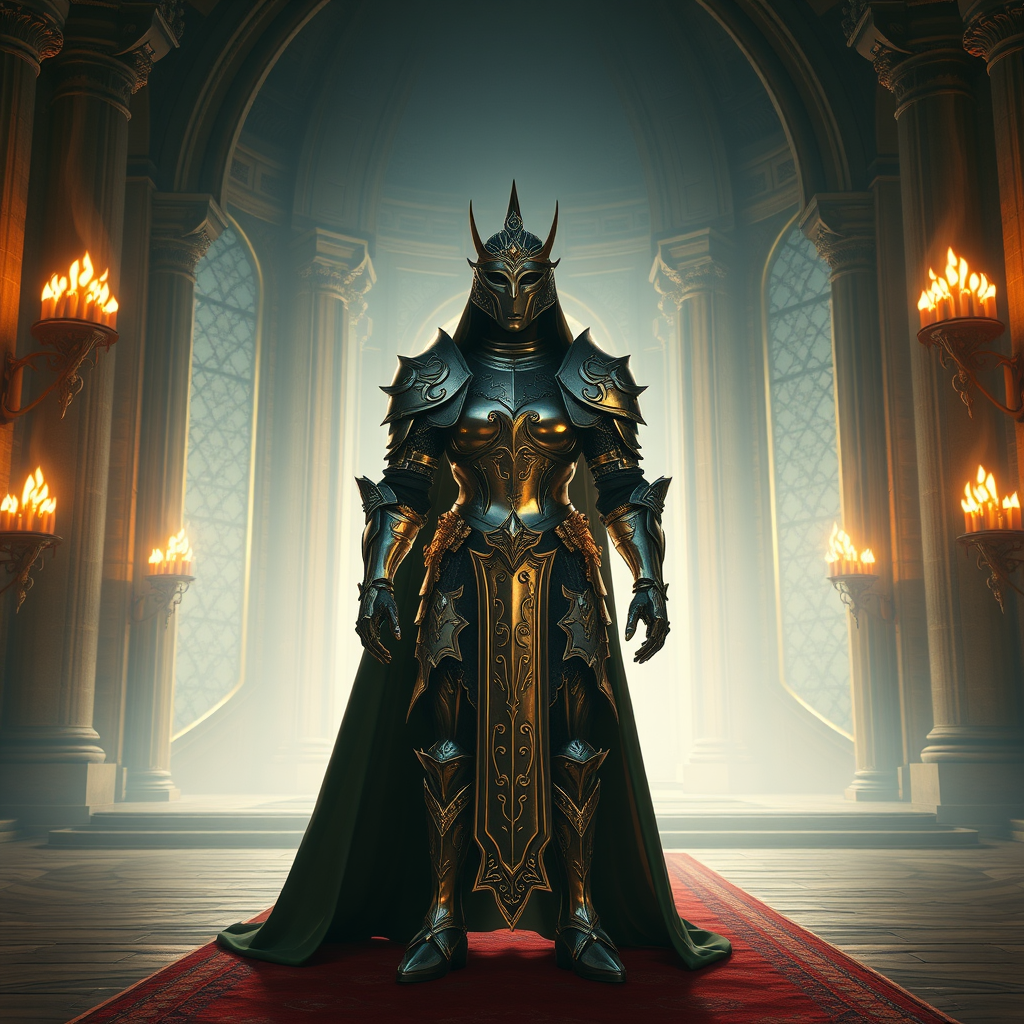 As you step into the grand hall, your gaze is irresistibly pulled toward the heart of the room, where the supreme Princess stands, wearing a suit of armor that is both intricately beautiful and powerfully practical. The armor shimmers in the dancing light of the torches, casting a luminous glow that bathes the room in an otherworldly aura.