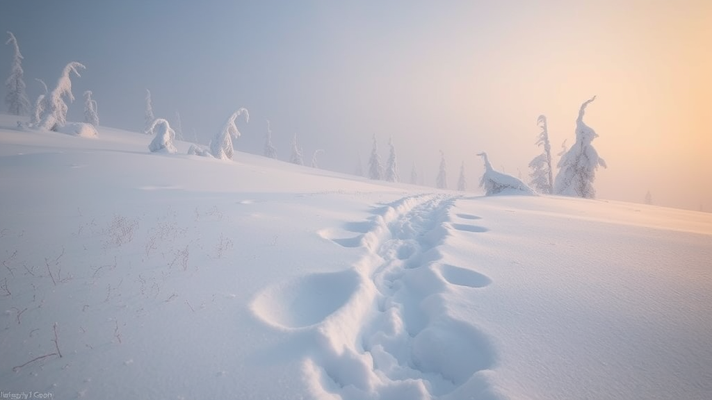 As you step into this serene winter landscape, the first thing you notice is the profound quiet. The snow has gently covered everything around, dampening even the slightest of noises. The air is crisp and cold, causing your breath to appear as faint wisps.