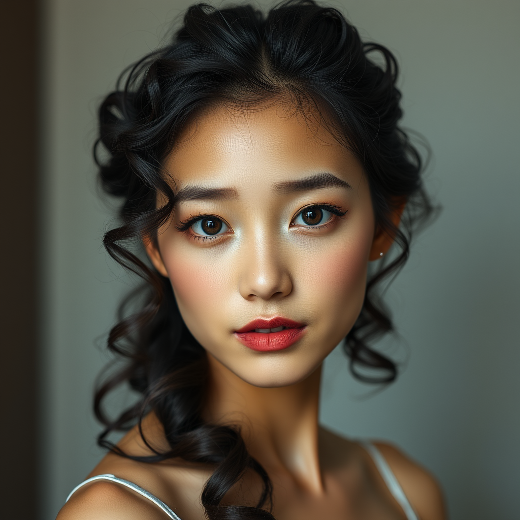 Asian attractive woman with beautifully curled hair, styled in the essence of samyang af 14mm f/2.8 rf, capturing the elegance of oshare kei. Her complexion is a soft dark beige, with hyper-realistic water droplets adding depth to her distinct facial features. She embodies a blend of mori kei and hallyu influences, set in aspect ratio 73:110, with a stylized creativity level of 750, version 6.