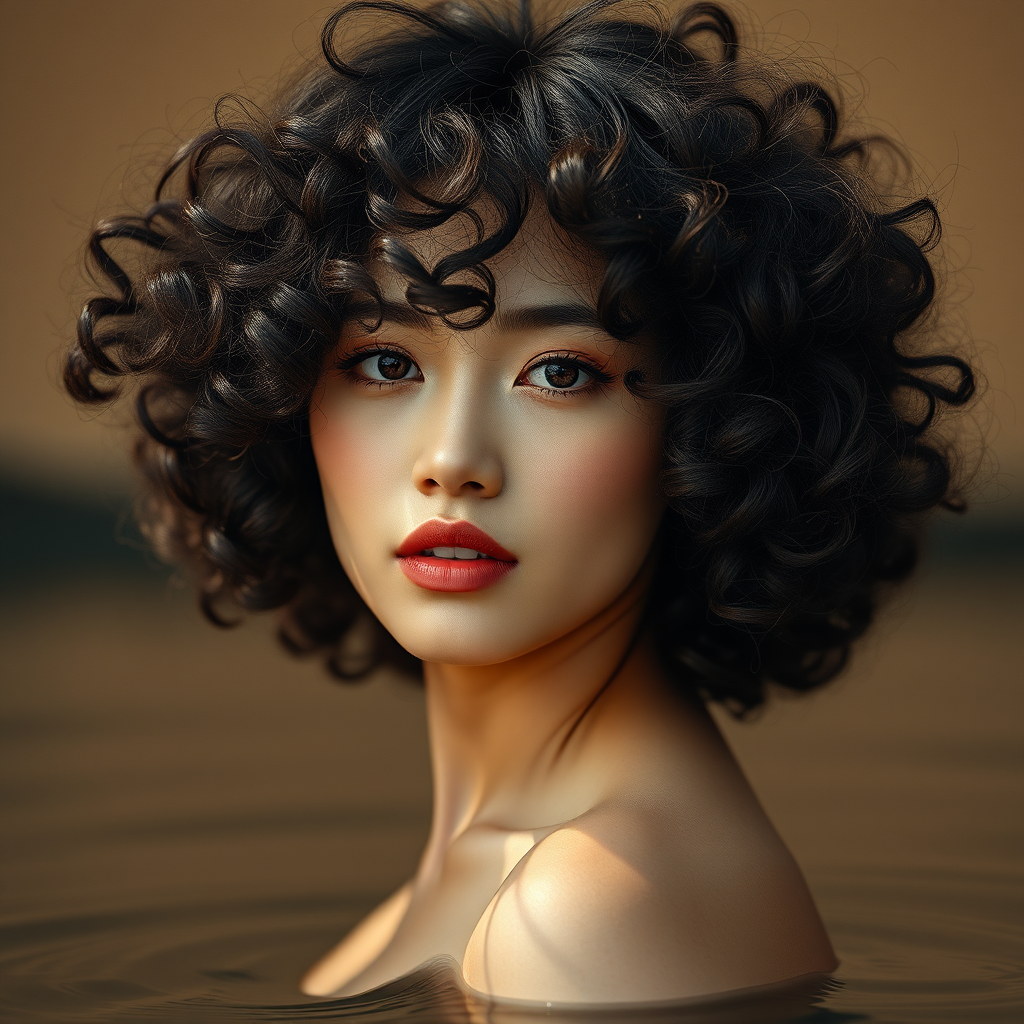 asian attractive woman with voluminous curly hair, captured in samyang af 14mm f/2.8 rf style, oshare kei influence, set against a warm dark beige backdrop, hyper-realistic water reflections, striking and distinct facial features, infused with mori kei and hallyu aesthetics, expressive atmosphere, nuanced detailing, and balanced elegance --aspect ratio 73:110 --stylization 750 --version 6