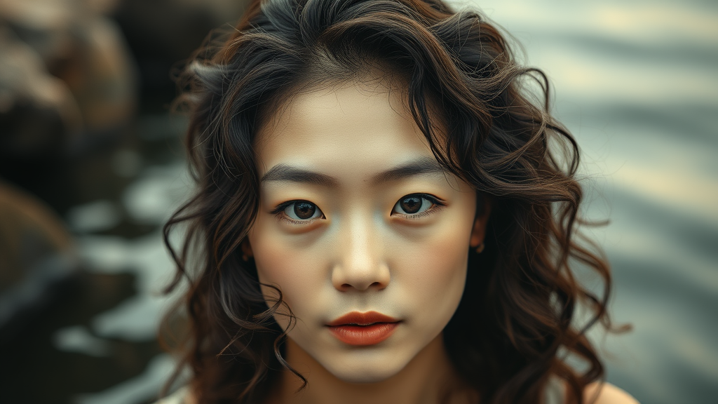 Asian captivating woman with softly curled hair, captured in the essence of Samyang AF 14mm f/2.8 RF style, oshare kei influence, warm dark beige tones, ultra-realistic water elements, pronounced and unique facial features, mori kei aesthetic, infused with hallyu inspiration, maintaining a 73:110 aspect ratio, enhanced with stylization.