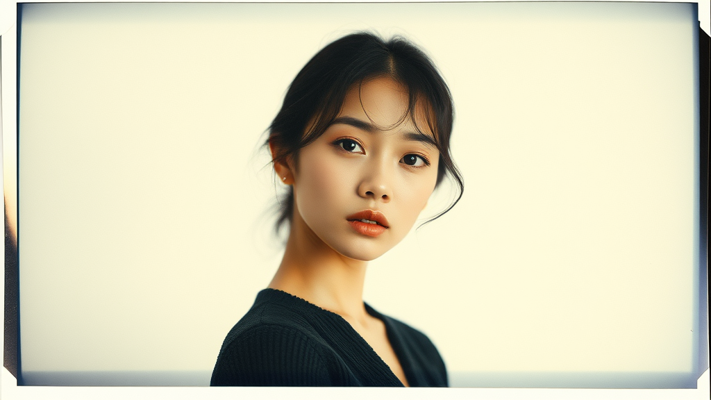 Asian female model, Polaroid test shot for a fashion photoshoot, hyper-realistic and lifelike portrayal, aspect ratio 35:64, raw and unfiltered style with subtle creative nuances capturing natural beauty and authentic expression.