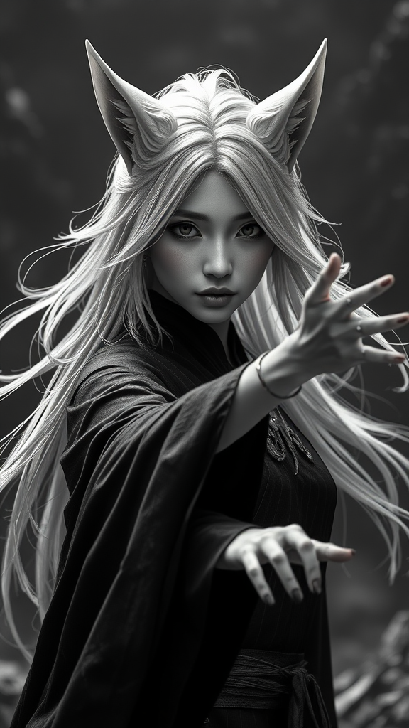 Asian female Sith lord with flowing white hair and feline ears, rendered in hyperdetail and 8k resolution. She strikes a dynamic pose in a vivid, immersive background that enhances the depth of field, all presented in striking monochrome and grayscale tones. Her presence is intensified by a forceful and commanding aura, embodying the essence of a masterpiece. BadNegAnatomyV1-neg, easynegative, FastNegativeV2, ng_deepnegative_v1_75t, rmadanegative402_sd15-neg, verybadimagenegative_v1.3 filters applied, removing any artistic flaws.