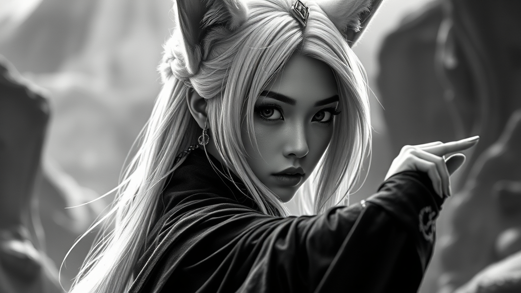 Asian female Sith lord with striking white hair and feline-like cat ears, portrayed in a hyperdetailed, masterpiece-quality style, dynamically posed against an immersive background. The image is captured in 8k resolution with a monochrome, grayscale aesthetic, enhancing the depth of field. Numerous negative filters such as BadNegAnatomyV1, EasyNegative, FastNegativeV2, ng_deepnegative_v1_75t, rmadanegative402_sd15, and verybadimagenegative_v1.3, as well as a filter to eliminate poor artistry, have been applied, ensuring optimal quality.
