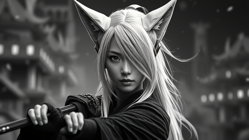 Asian female Sith, striking white hair, feline ears, hyperdetailed, masterpiece quality, 8k resolution, captured in a dynamic stance, surrounded by an immersive backdrop, featuring depth of field, presented in a monochrome grayscale. Enhanced image quality with BadNegAnatomyV1-neg, easynegative, FastNegativeV2, ng_deepnegative_v1_75t, rmadanegative402_sd15-neg, verybadimagenegative_v1.3, bad artist-neg filtering applied.