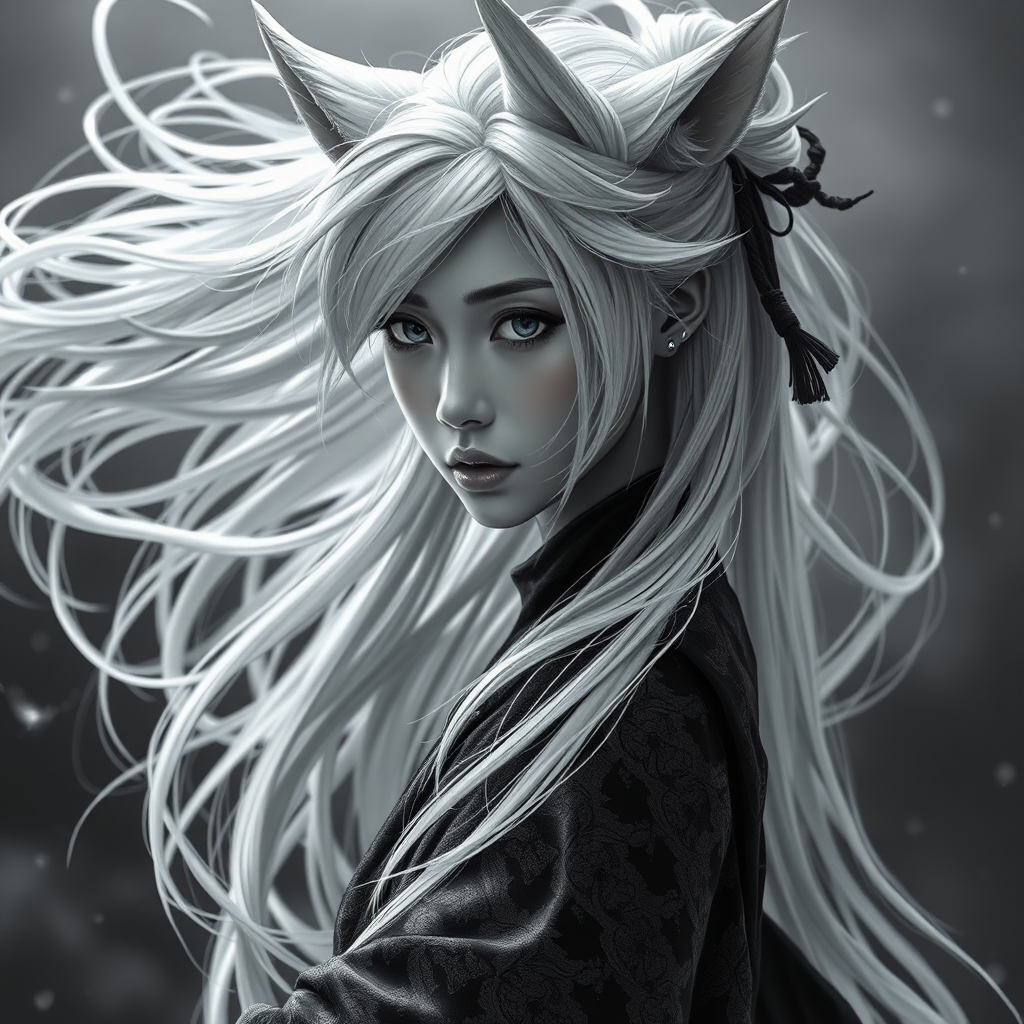 Asian girl, dark side warrior, flowing white hair, feline ears, hyper-detailed, striking composition, 8k quality, dynamic stance, captivating background, nuanced depth, monochrome, grayscale, harmonious proportions, refined aesthetics, seamlessly intricate, intense focus, vividly immersive, alluring aura, ethereal shadows, enigmatic elegance.