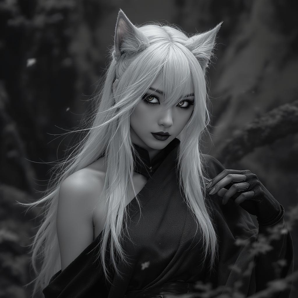 Asian girl, Sith lord, silver hair, feline ears, hyperdetailed, stunning masterpiece, 8k resolution, dynamic and powerful pose, immersive and atmospheric background, nuanced depth of field, monochrome and grayscale tones, enhanced with negative balance filters like BadNegAnatomyV1-neg, easynegative, FastNegativeV2, ng_deepnegative_v1_75t, rmadanegative402_sd15-neg, verybadimagenegative_v1.3, poor artistry filtered out.