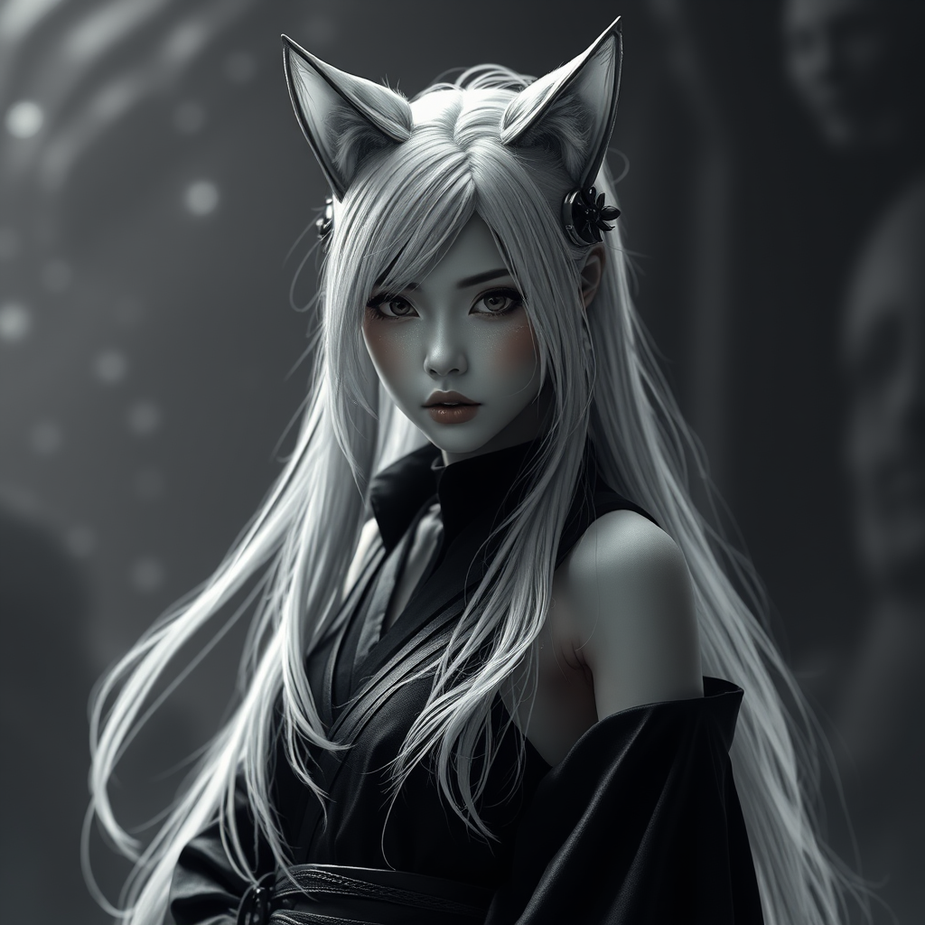 Asian girl Sith lord with cat ears, cascading white hair, and intense hyperdetailed features. She stands in a dynamic pose, shrouded in a masterpiece of monochrome grayscale. The immersive background highlights her dark allure, with a stunning depth of field that emphasizes her commanding presence. The scene captures a blend of mystique and power, with hints of hyper-realism while subtly modifying the negative aspects: BadNegAnatomyV1-neg, easynegative, FastNegativeV2, ng_deepnegative_v1_75t, rmadanegative402_sd15-neg, verybadimagenegative_v1. 3, bad artist -neg.