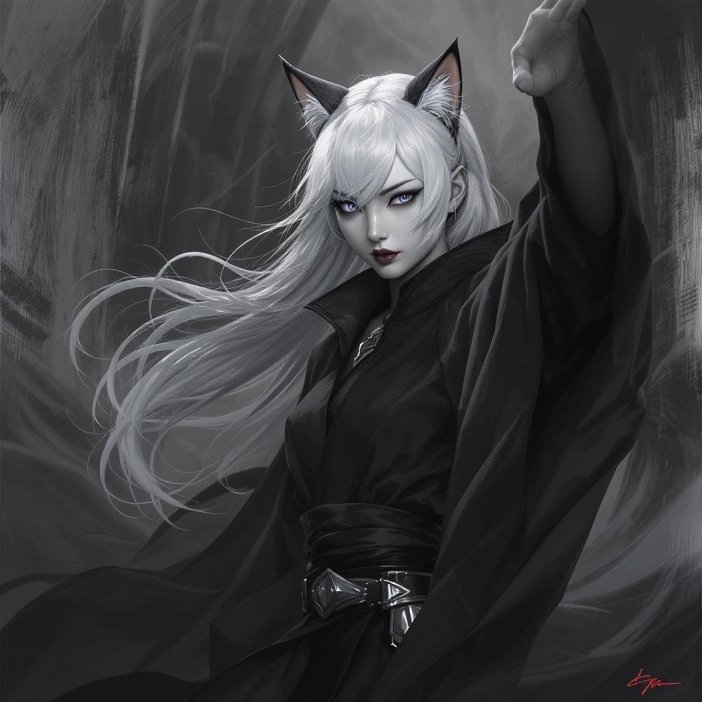 Asian girl Sith lord with striking white hair and cat ears, portrayed in a masterpiece of hyperdetail with an 8k resolution. She strikes a dynamic pose against an immersive, grayscale background with a strong depth of field, enhancing the monochrome aesthetic. The image is subtly refined with smooth lines and meticulous contrast, exuding a sense of power and elegance without the hindrance of common negative elements, resulting in a captivating visual narrative.