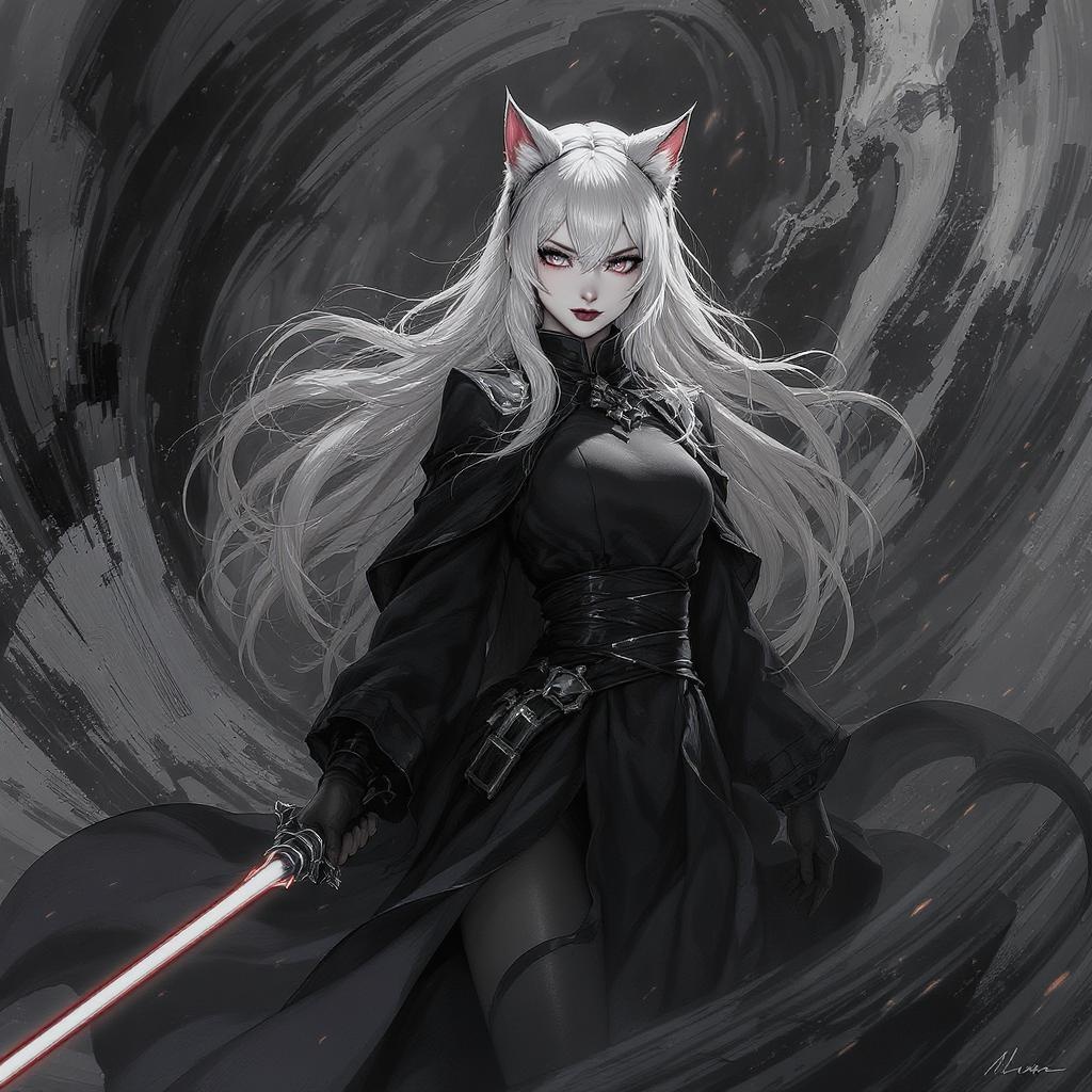 Asian girl Sith lord with white hair and cat ears in a hyperdetailed masterpiece rendered in 8k, displaying a dynamic pose within an immersive background. The scene is set in monochrome grayscale with depth of field enhancing the composition. Balanced elements ensure anatomical accuracy and superior image quality with tags like BadNegAnatomyV1, easynegative, verybadimagenegative_v1.3 excluded to refine visual impact.